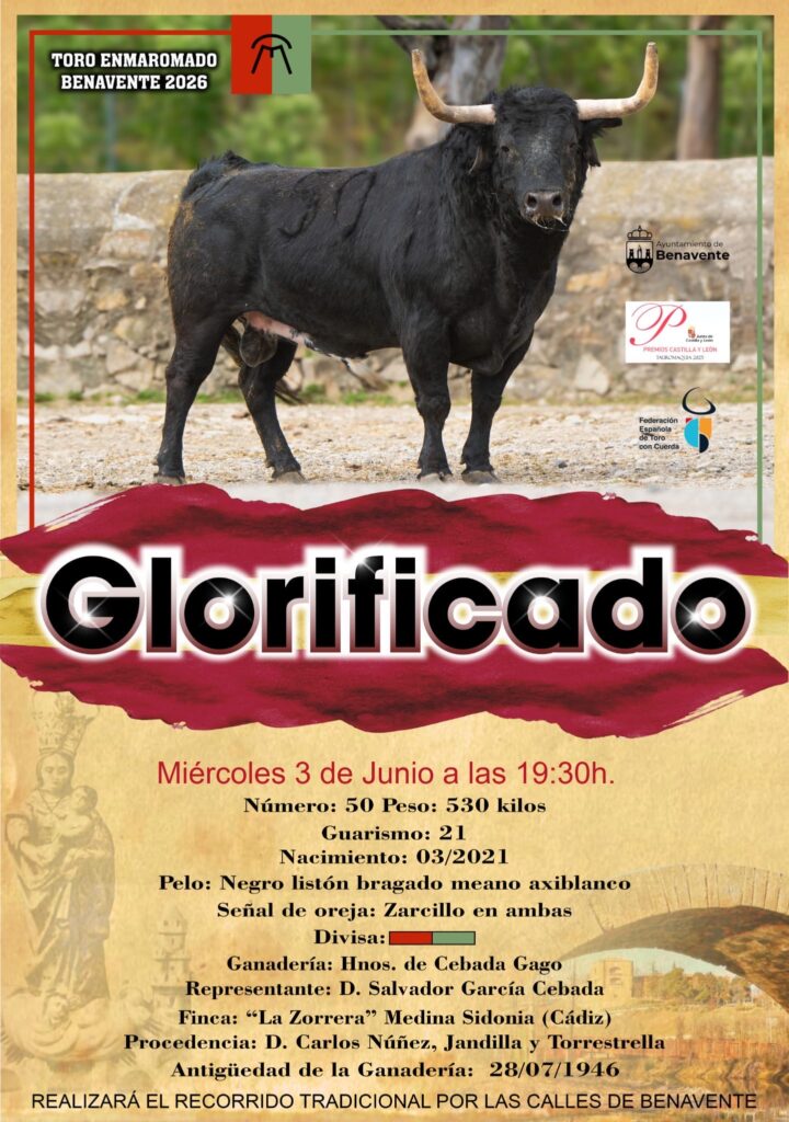 Benavente ya tiene toro para su tradicional festejo del Toro Enmaromado 2026. Se llama Glorificado, lleva el número 50, pesa 530 kilos y procede de la legendaria ganadería de Hnos. de Cebada Gago, una de las más prestigiosas y exigentes del campo bravo español. El miércoles 3 de junio, a las 19:30 horas, recorrerá las calles de la ciudad zamorana en el tradicional encierro que cada año congrega a miles de personas.