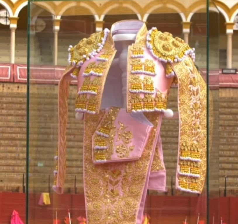 Los vestidos que se muestran —entre ellos uno en tono oro intenso y otro en una elegante combinación de rosa y alamares dorados— serán los mismos que el diestro lucirá en sus compromisos más esperados del ciclo, previstos para mediados y finales de abril, en el marco de la emblemática Feria de Abril de Sevilla.
