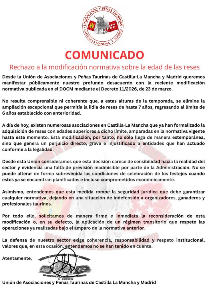 La Unión de Asociaciones y Peñas Taurinas de Castilla-La Mancha y Madrid ha emitido un comunicado en el que expresa su «profundo desacuerdo» con la reciente modificación normativa publicada en el Diario Oficial de Castilla-La Mancha mediante el Decreto 11/2026, de 23 de marzo, que elimina la ampliación excepcional que permitía la lidia de reses de hasta 7 años de edad, devolviendo el límite al máximo de 6 años establecido con anterioridad.